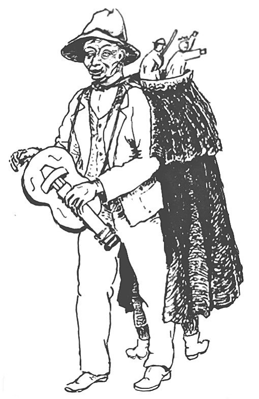 Ciego gallego con monifates. Dibujo en Leandro Carré Alvarellos, "Mantelpuppen in Galicia", en: Perlicko-Perlacko: Fachblätter für Puppenspiel, Hans Richard Purschke, Frankfurt am Main, vol. 4, nº 1 (1971), p. 63.
